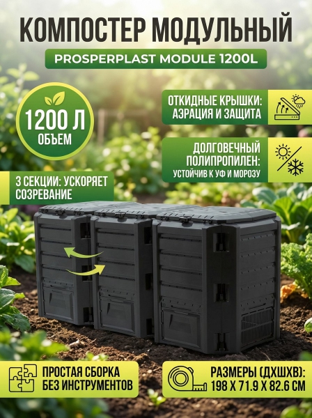 Компостер Prosperplast Module 1200л - ОписаниеМодульный трехсекционный компостер Module состоит из 3 модулей общей емкостью 1200 л. Это идеальный выбор для требовательных клиентов, которые хотят быстро и эффективно производить большое количество натуральных удобрений.