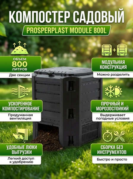 Компостер Prosperplast Module 800л - ОписаниеКомпостер Module состоит из 2 модулей общей емкостью 800 л. Он сочетает в себе все преимущества традиционного компостера с повышенной эффективностью. Имеет удобную ручку для открывания крышки и небольшие отверстия в корпусе, что обеспечивает свободную подачу воздуха.