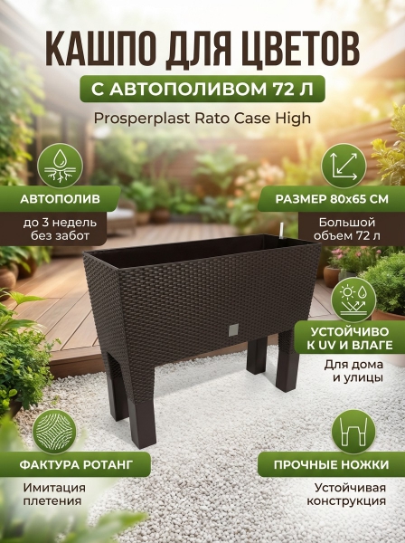 Кашпо для цветов с автополивом Prosperplast Rato Case High - ОписаниеКашпо с автополивом Rato Case High является замечательным украшением садового интерьера, дома, зоны отдыха. Изделие выполнено с имитацией под натуральный ротанг и имеет две устойчивые ножки, что делает его стильным элементом декора.
