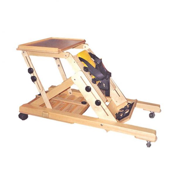 Опора для стояния Протэкс-Гарант "Мишутка" - ОписаниеОпора для стояния Мишутка – вертикализатор с регулируемым углом наклона от 0° до вертикального положения на колёсиках с тормозами, поэтапно переводит пациента из положения (горизонтального) лежа на животе в положение стоя. Имеет от 4-х до 8-ми положений наклона. Крепления для стоп, колен, тазобедренного и грудного отделов регулируются по ширине и по высоте с помощью маховичковых винтов. Регулируемые крепления колен, как по ширине (по расстоянию между коленами ), так и по высоте. Регулировка тазобедренного крепления по высоте. Регулируемые крепления для стоп (сандалии), которые могут быть поставлены в нужное положение «на ширину плеч». Изделие легко складывается с помощью барашков. Столик имеет взаимозаменяемые столешницу и таз для воды. Опора установлена на колесах, задняя пара колес имеет тормоза. Мягкие элементы на поролоне, обтянуты кожей.