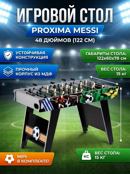 Игровой стол для футбола Proxima Messi G34800-1 48" - ОписаниеСомневаетесь? - Посмотрите рейтинг ТОП-10 по категории «Настольный футбол (кикер)»Привлекательный дизайн игрового стола идеально спишется в любой интерьер помещения, а компактные размеры стола позволят насладиться увлекательной игрой. Игровой стол изготовлен из качественных материалов, устойчив даже при самой активной игре. Корпус выполнен из специального (прочного) МДФ, сверху покрытого пластиком с ярким орнаментом.