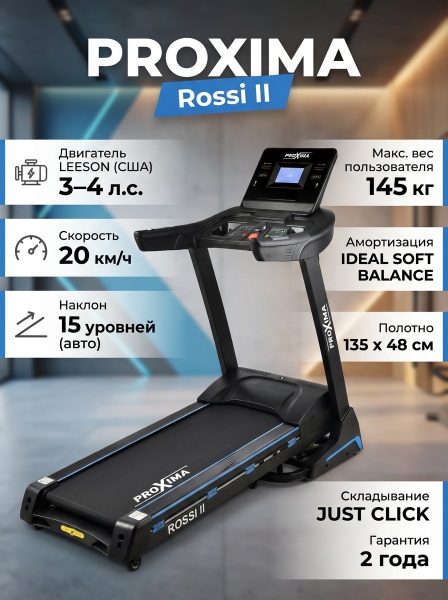 Беговая дорожка электрическая Proxima Rossi II PROT-222 - ОписаниеСомневаетесь? - Посмотрите рейтинг ТОП-10 по категории «Домашние беговые дорожки»Электрическая беговая дорожка Proxima Rossi II – это идеальное сочетание всего необходимого функционала для эффективных кардио-тренировок. Дорожка оснащена инновационным двигателем LEESON мощностью 3 л.с., способным развивать скорость движения полотна от 1 до 20 км/ч. Кроме того, в плату управления двигателя интегрированы электронные компоненты нового поколения, которые позволяют быстро, но максимально плавно регулировать нагрузки.