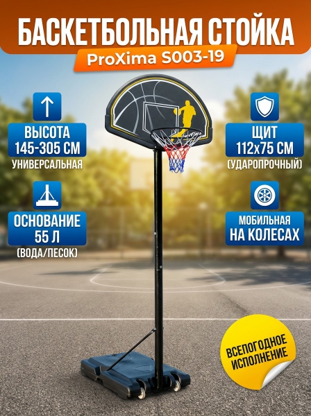 Мобильная баскетбольная стойка Proxima S003-19 - ОписаниеСомневаетесь? - Посмотрите рейтинг ТОП-10 по категории «Баскетбол»Баскетбольная мобильная стойка предназначена для домашнего использования (на улице и в помещениях). Материалы, применяемые для изготовления стойки, устойчивы к различным атмосферным явлениям и обладают повышенной износоустойчивостью.