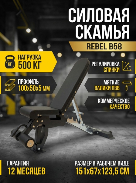 Скамья универсальная Rebel B58 - ОписаниеСкамья универсальная Rebel-B58 подходит для выполнения широкого комплекса упражнений, как новичками, так и опытными пользователями. Надежная рама и простые в использовании механизмы регулировки позволяют подстроить ее под определенные габариты и цели спортсменов.