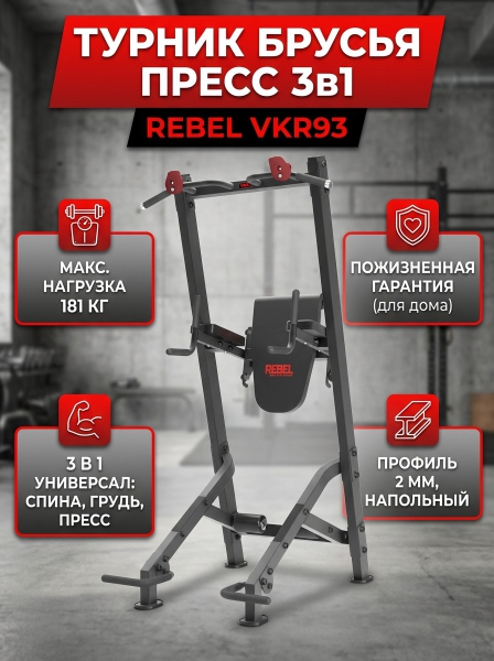 Тренажер пресс-турник-брусья REBEL VKR93 - ОписаниеСомневаетесь? - Посмотрите рейтинг ТОП-10 по категории «Турники»Тренажер Rebel VKR93 – это стильное оборудование для комфортных тренировок дома или в спортивном зале, которое позволяет выполнять широкий комплекс силовых упражнений. Прочная и надежная конструкция модели подойдет для коммерческого использования в спортивных клубах и других местах с большой проходимостью.