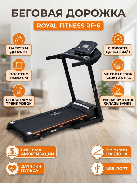 Электрическая беговая дорожка Royal Fitness RF-6 - ДоставкаДоставка по Санкт-Петербургу: бесплатно, 2-3 дня Доставка по России: стоимость уточняйте у оператора. Электрическая беговая дорожка Royal Fitness RF-6 - Отзывы5.0