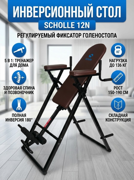 Инверсионный стол Scholle 12N - ОписаниеИнверсионный стол с дополнительными функциями Scholle 12N станет незаменимым домашним тренажёром для различных силовых тренировок: от подтягиваний до обратных отжиманий.