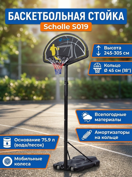 Мобильная баскетбольная стойка Scholle S019 - ОписаниеСомневаетесь? - Посмотрите рейтинг ТОП-10 по категории «Баскетбол»Мобильная стойка S019 с диаметром баскетбольного кольца 45 см. (18’) и размером щита 112 x 72 см. Бесступенчатая регулировка высоты кольца от 2,45 до 3,05 м.