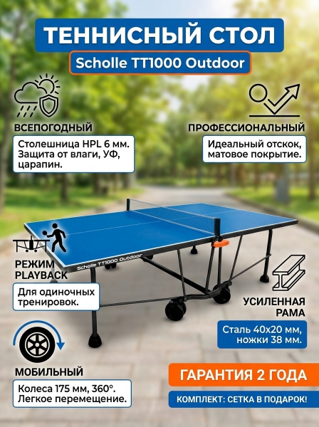 Теннисный стол Scholle TT1000 Outdoor - ДоставкаДоставка по Санкт-Петербургу: бесплатно, 2-3 дня Доставка по России: стоимость уточняйте у оператора. Теннисный стол Scholle TT1000 Outdoor - Отзывы0.0