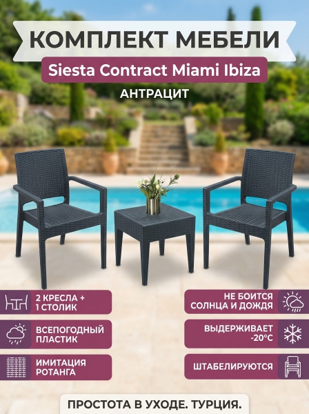 Комплект пластиковой мебели Siesta Contract Miami Ibiza - ДоставкаДоставка по Санкт-Петербургу: бесплатно, 2-3 дня Доставка по России: стоимость уточняйте у оператора. Комплект пластиковой мебели Siesta Contract Miami Ibiza - Отзывы0.0