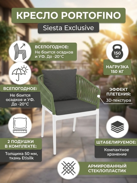 Кресло пластиковое с подушками Siesta Contract Portofino, белый, оливковый, тёмно-серый - ОписаниеКресло Portofino от турецкой фабрики Siesta Contract представляет собой стильное и надежное решение для уличного использования в сферах HoReCa и Contract. Выполненное из высококачественного полипропилена, армированного стекловолокном, кресло отличается исключительной прочностью и устойчивостью к воздействию внешней среды. Благодаря новейшим технологиям формования пластмасс под давлением, материал кресла устойчив к выцветанию и деформации, а нескользящие ножки обеспечивают безопасность и стабильность как внутри помещений, так и на улице. Особый акцент сделан на обволакивающей спинке, плавно переходящей в подлокотники, с 3D-эффектом плетения из плоского роупа, что придает креслу современный вид и визуально напоминает натуральное плетение, сохраняя при этом преимущества пластика.