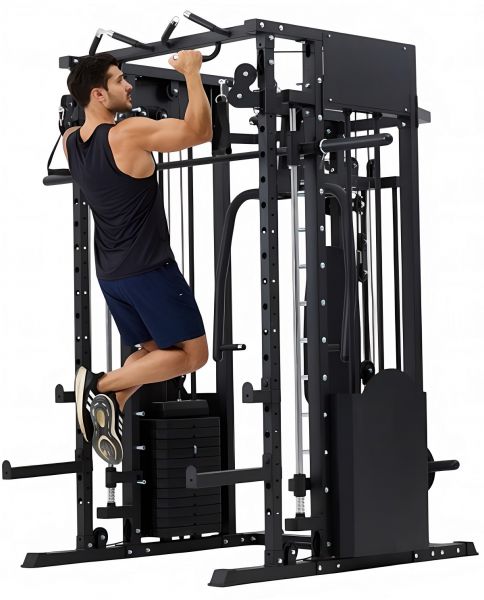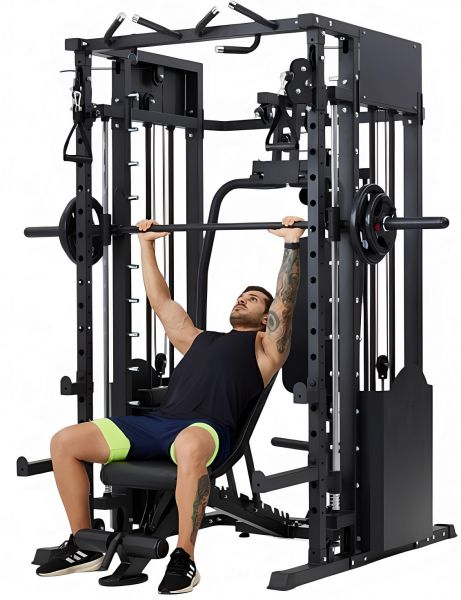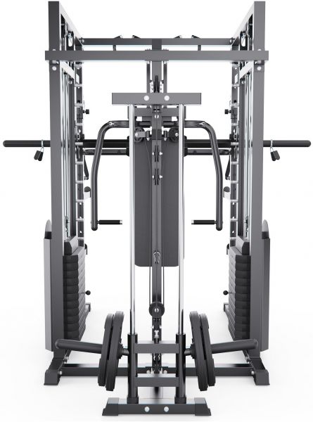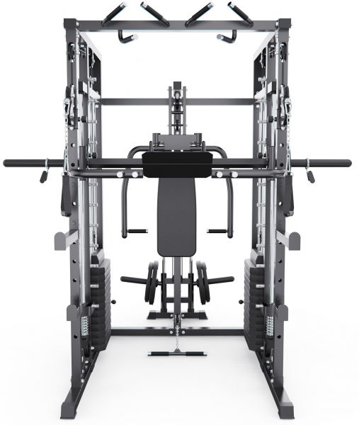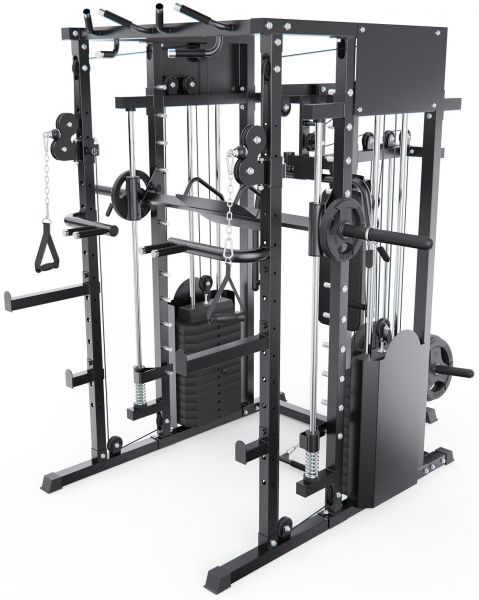 Многофункциональный силовой комплекс позволяет выполнять широкий спектр упражнений: жимы и тяги для груди и спины, верхнюю и нижнюю тягу, баттерфляй, упражнения на бицепс и трицепс, тяги к поясу, приседания и упражнения со штангой, а также тренировки на пресс.