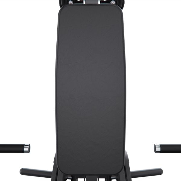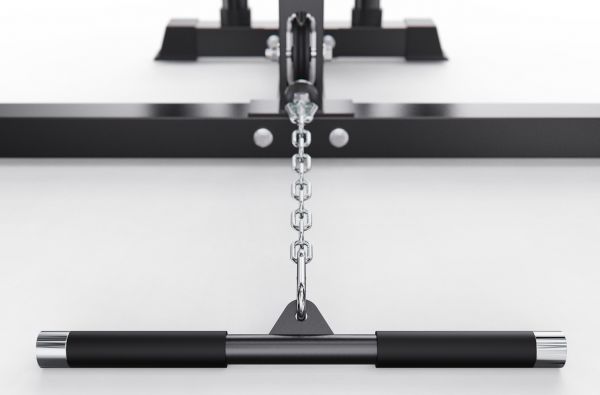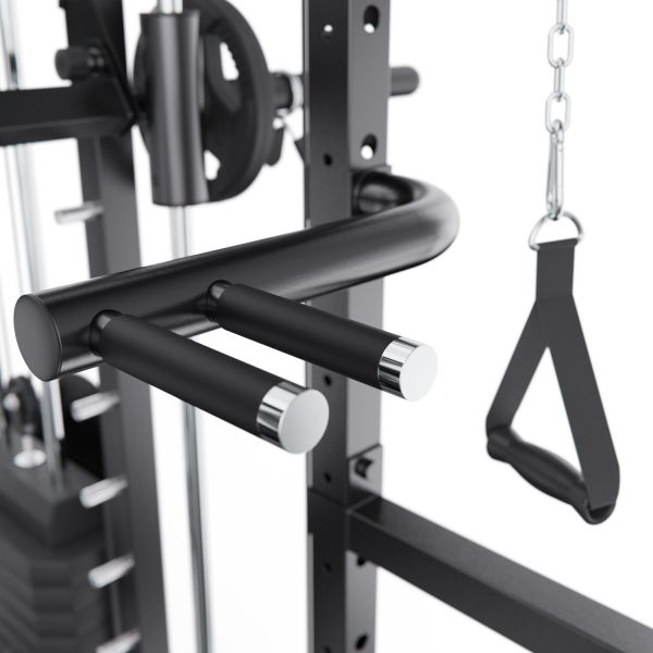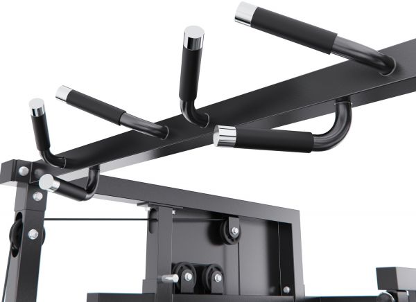 Верхняя часть комплекса оборудована турником с несколькими вариантами хвата, что позволяет акцентировать нагрузку на различные участки мышц спины, плеч и рук. В комплект также входит V-образная тяговая рукоятка, предназначенная для тяг узким хватом и тяг к поясу, обеспечивающая глубокую и точную проработку широчайших мышц спины.