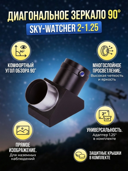 Диагональное зеркало Sky-Watcher 90° 2” - ОписаниеДиагональное зеркало Sky-Watcher – это полезный аксессуар для рефракторов и катадиоптриков. Зеркало позволяет получить неперевернутое изображение, что особенно ценно при изучении наземных объектов. Кроме того, диагональное зеркало дает возможность смотреть в телескоп из более комфортного положения.