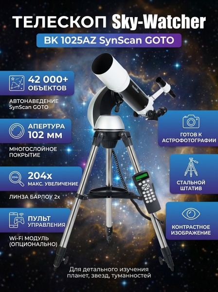 Телескоп Sky-Watcher BK 1025AZ Synscan GOTO - ОписаниеТелескоп-рефрактор Sky-Watcher BK 1025 c монтировкой AZ SynScan GOTO и комплектом основных оптических аксессуаров – это высокотехнологичный инструмент для ведения обзорных наблюдений за космосом, для подробного изучения космических объектов (звезд, планет, туманностей, спутников и т. д.), при наличии дополнительного оборудования – для занятия астрофотографией. В зависимости от используемого окуляра степень увеличения телескопа в базовой комплектации может составлять 25х или 50х, при установке линзы Барлоу – усиливаться еще в два раза, а максимально возможная потенциальная кратность устройства составляет 204х. Апертура Sky-Watcher BK 1025 – 102 мм, фокусное расстояние – 500 мм. Линзы в объективе телескопа имеют полное многослойное покрытие, помогающее формировать стабильно светлую, четкую и детализированную картинку наблюдаемого звездного неба.