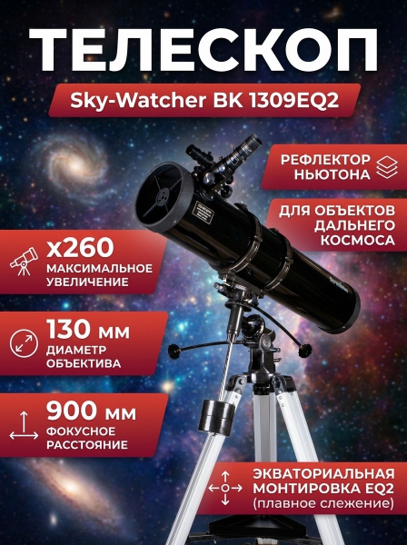 Телескоп на штативе Sky-Watcher BK 1309EQ2 - ОписаниеТелескоп Sky-Watcher BK 1309EQ2 создан для изучения объектов дальнего космоса. С его помощью можно увидеть тусклые звезды, кометы, астероиды, сотни туманностей, звездных скоплений, галактик и многое другое.