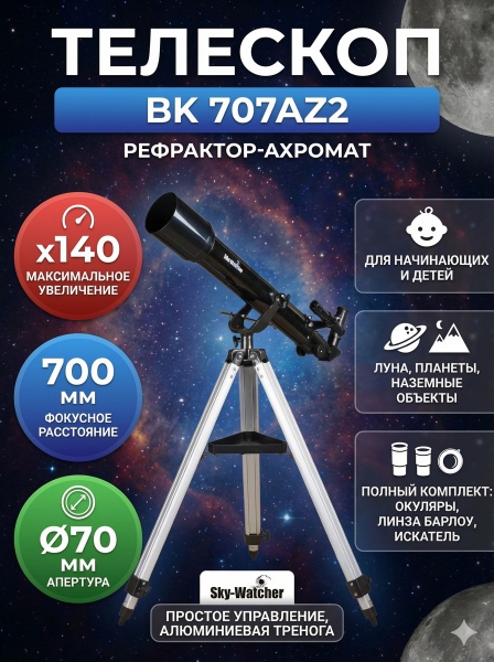 Телескоп на штативе Sky-Watcher BK 707AZ2 - ОписаниеТелескоп BK 707AZ2 хорошо подойдет начинающим любителям астрономии: у него простое управление и удобная конструкция. Это рефрактор-ахромат с апертурой 70 миллиметров (его объектив собирает на 36% больше света, чем у телескопа с объективом диаметром 60 миллиметров). В этот телескоп видны кратеры на Луне, пояса Юпитера, кольца Сатурна и другие интересные объекты в Солнечной системе. Оптический прибор подойдет и для ландшафтных наблюдений.