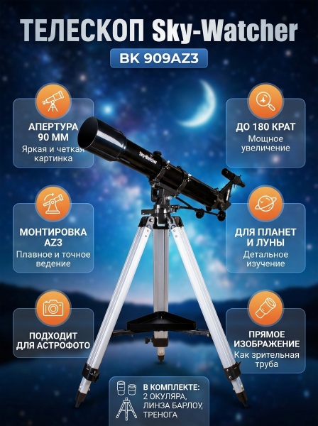 Телескоп рефракторный Sky-Watcher BK 909AZ3 - ОписаниеBK 909AZ3 – рефрактор для любителей астрономии разного уровня подготовки, он подойдет и начинающим, и более опытным. Оптические элементы просветлены, поэтому телескоп формирует четкую и контрастную картинку. Этот оптический прибор подойдет для наблюдений астрономических объектов Солнечной системы и ярких объектов дальнего космоса.