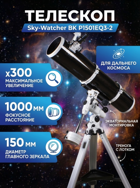 Телескоп на штативе Sky-Watcher BK P1501EQ3-2 - БрендСтрана бренда: КНР Премиальность бренда:Посмотреть все зеркальные телескопы-рефлекторы Sky-Watcher (33) Телескоп на штативе Sky-Watcher BK P1501EQ3-2 - Характеристики