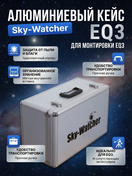 Кейс алюминиевый Sky-Watcher для монтировки EQ3 - ОписаниеПрочный алюминиевый кейс Sky-Watcher предназначен для хранения и транспортировки экваториальной монтировки EQ3. Внутри также имеются отделения для аксессуаров к монтировке.