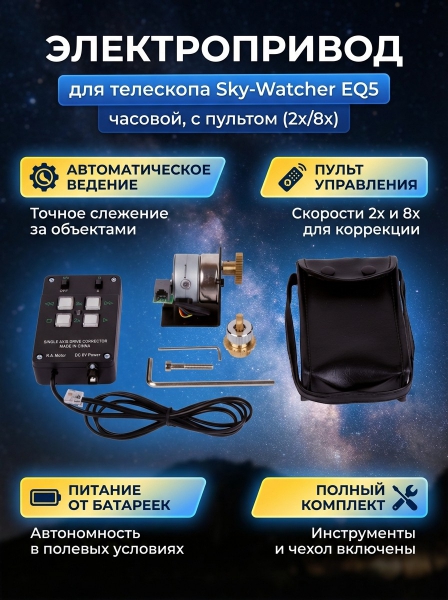 Электропривод часовой оси с пультом для телескопа Sky-Watcher для монтировки EQ5 - ДоставкаДоставка по Санкт-Петербургу: бесплатно, 2-3 дня Доставка по России: стоимость уточняйте у оператора. Электропривод часовой оси с пультом для телескопа Sky-Watcher для монтировки EQ5 - Отзывы0.0