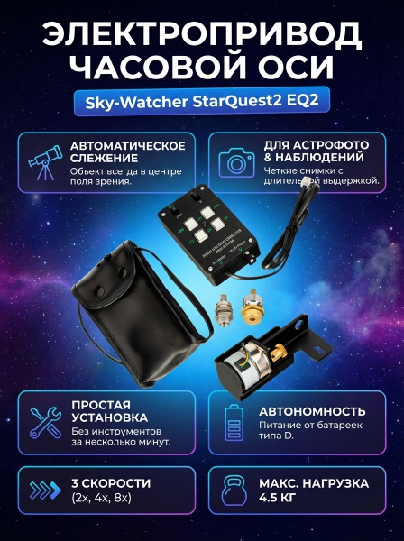 Электропривод часовой оси для монтировки Sky-Watcher StarQuest2 EQ2 - ДоставкаДоставка по Санкт-Петербургу: бесплатно, 2-3 дня Доставка по России: стоимость уточняйте у оператора. Электропривод часовой оси для монтировки Sky-Watcher StarQuest2 EQ2 - Отзывы0.0
