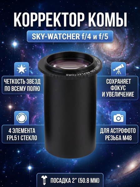 Корректор комы Sky-Watcher для рефлекторов Ньютона f/4 и f/5 - ОписаниеКорректор комы Sky-Watcher – это полезный аксессуар, позволяющий добиться максимального качества картинки. Корректор обеспечивает широкое поле зрения, причем изображение получается четким и неискаженным и в центре, и на периферии.