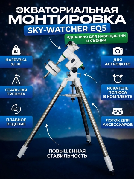 Монтировка с искателем полюса на треноге Sky-Watcher EQ5 - ДоставкаДоставка по Санкт-Петербургу: бесплатно, 2-3 дня Доставка по России: стоимость уточняйте у оператора. Монтировка с искателем полюса на треноге Sky-Watcher EQ5 - Отзывы0.0