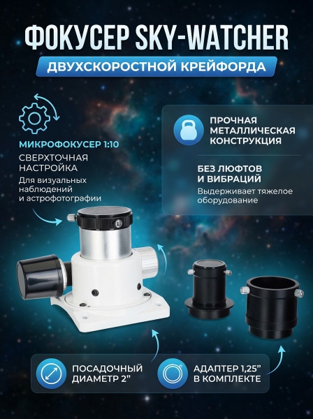 Фокусер Sky-Watcher Крейфорда 1,25"/2" двухскоростной - ОписаниеФокусер Крейфорда Sky-Watcher подходит для профессиональных астрономов, астрофотографов и опытных наблюдателей. Благодаря системе с роликовыми подшипниками он обеспечивает плавное движение без люфтов и плавное наведение резкости, а двухскоростной механизм помогает при фокусировке на больших увеличениях. Посадочный диаметр фокусера – 2 дюйма, адаптер с 2 дюймов на 1,25 дюйма расширяет выбор окуляров, совместимых с этим аксессуаром.