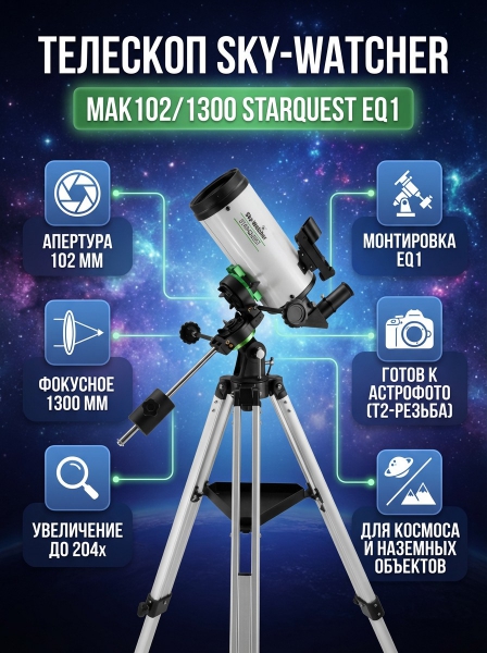 Телескоп на штативе Sky-Watcher MAK102/1300 StarQuest EQ1 - ОписаниеЗеркально-линзовый телескоп Sky-Watcher MAK102/1300 StarQuest EQ1 – это компактные размеры, малый вес и отличные оптические возможности для визуальных наблюдений и начальной астрофотографии. С этим телескопом удобно путешествовать и ездить на загородные астрофесты, при этом он способен показать космос во всем его многообразии. По своим возможностям телескоп универсален – хорошо показывает и ближний, и дальний космос, также его можно использовать как мощную зрительную трубу для наблюдений за наземными объектами.