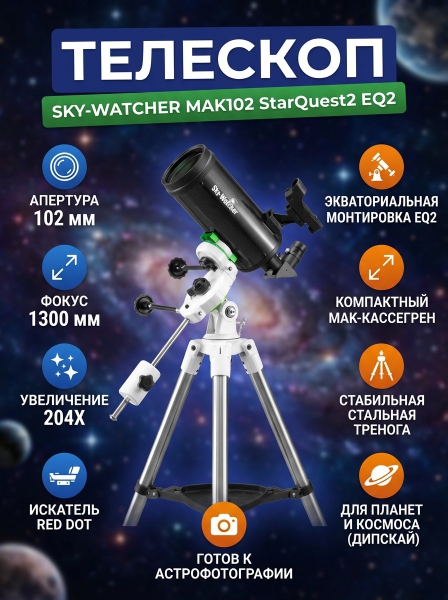 Телескоп Sky-Watcher MAK102 StarQuest2 EQ2 - ДоставкаДоставка по Санкт-Петербургу: бесплатно, 2-3 дня Доставка по России: стоимость уточняйте у оператора. Телескоп Sky-Watcher MAK102 StarQuest2 EQ2 - Отзывы0.0
