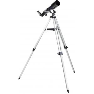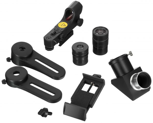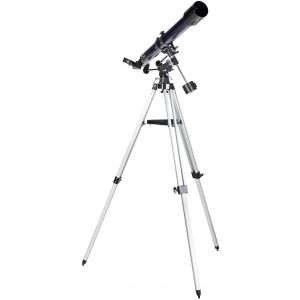 Телескоп Sky-Watcher MAK90 StarQuest EQ1 - ОписаниеДля тех, кто ищет универсальный инструмент для астрономических наблюдений за городом, отличным выбором станет телескоп Sky-Watcher MAK90 StarQuest EQ1. Его главной особенностью является компактная и высокомобильная конструкция, построенная по оптической схеме Максутова-Кассегрена. Зеркально-линзовая система с апертурой 90 мм и фокусным расстоянием 1250 мм гарантирует формирование четкого изображения с высокой детализацией и минимальным уровнем аберраций, что позволяет использовать прибор не только для наблюдений звездного неба, но и для рассматривания наземных объектов и ландшафтов. Оптическая мощность прибора открывает широкие возможности для астрономических исследований начального и продвинутого уровней: вы сможете изучать лунные кратеры диаметром от 5 км, наблюдать фазы Меркурия, различить щель Кассини в кольцах Сатурна, увидеть Уран и Нептун в виде крошечных дисков, обнаружить множество объектов из каталогов Мессье и NGC. Кроме того, вам станут доступны десятки планетарных и диффузных туманностей, а также некоторые шаровые скопления. Это позволяет назвать телескоп Sky-Watcher MAK90 StarQuest EQ1 настоящим ключом, открывающим все тайны Солнечной системы и дальнего космоса. Телескоп поставляется в комплекте с экваториальной монтировкой StarQuest EQ1. Управление инструментом осуществляется вручную с помощью 2 ручек тонких движений, которые обеспечивают быструю и точную подстройку по обеим осям. Для крепления оптической трубы используется надежная система «ласточкин хвост» стандарта Vixen. Плавность хода и простота ведения небесных объектов достигаются за счет внутренних шестерней с червячными передачами. Каждая из передач имеет 122 зубца, что делает процесс наведения мягким и аккуратным. Вся астрономическая конструкция устанавливается на легкую и прочную алюминиевую треногу с регулируемой высотой (входит в комплект). Такое основание обеспечивает прекрасную устойчивость, делая процесс наблюдения за звездным небом комфортным даже в течение многих часов.