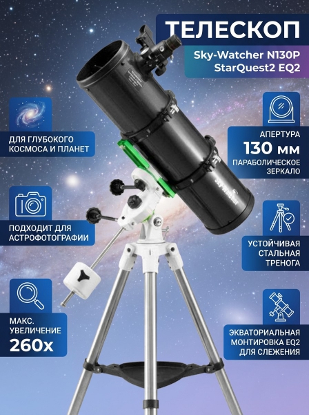 Телескоп Sky-Watcher N130P StarQuest2 EQ2 - ОписаниеТелескоп Sky-Watcher N130P StarQuest2 EQ2 относится к категории рефлекторов и отлично подходит для изучения большинства наиболее интересных космических объектов: туманностей, звездных скоплений, галактик, облачных поясов на Сатурне, астероидов и комет, гор и кратеров на поверхности Луны, деталей не поверхности Марса и так далее. За счет особенностей строения внутренней зеркальной конструкции с параболическим зеркалом, изображение, получаемое с телескопа, не искажается хроматическими и сферическими аберрациями, всегда имеет высокую четкость, контрастность и ясность даже на предельных увеличениях. Также Sky-Watcher N130P StarQuest2 EQ2 подходит для занятия астрофотографией.
