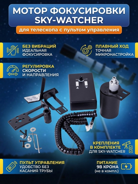 Мотор фокусировки для телескопа Sky-Watcher с пультом - ОписаниеМотор фокусировки Sky-Watcher – это полезный аксессуар, с помощью которого настройка фокуса будет быстрой, простой и точной. При ручной фокусировке труба может дрожать, что особенно заметно при наблюдениях на больших увеличениях. Мотор фокусировки снабжен удобным пультом управления, поэтому нежелательная вибрация полностью исключается.