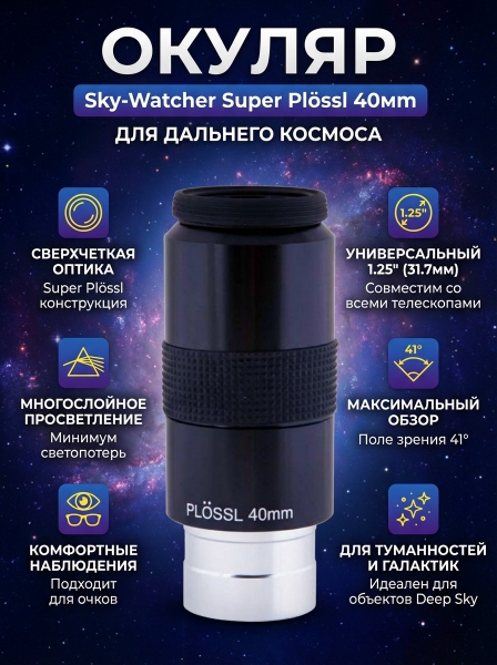 Окуляр Sky-Watcher Super Plössl 40 мм 1.25" - ОписаниеОбзорный окуляр Sky-Watcher Super Plössl 40 мм ориентирован на изучение объектов дальнего космоса. Он пригодится при изучении шаровых и рассеянных скоплений, туманностей и галактик. Благодаря высококачественной оптике вы сможете увидеть с его помощью астрономические объекты без геометрических и сферических искажений – по всему полю зрения окуляр передает картинку превосходного уровня.