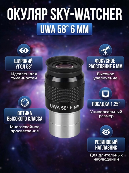Окуляр Sky-Watcher UWA 58° 6 мм 1.25” - ДоставкаДоставка по Санкт-Петербургу: бесплатно, 2-3 дня Доставка по России: стоимость уточняйте у оператора. Окуляр Sky-Watcher UWA 58° 6 мм 1.25” - Отзывы0.0