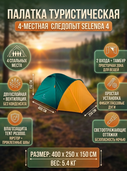 Палатка летняя двухслойная Следопыт Selenga 4 - ДоставкаДоставка по Санкт-Петербургу: бесплатно, 2-3 дня Доставка по России: стоимость уточняйте у оператора. Палатка летняя двухслойная Следопыт Selenga 4 - Отзывы0.0