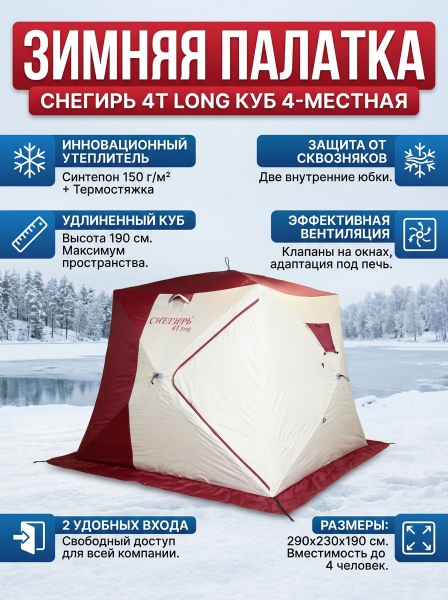 Зимняя палатка для четырех человек Снегирь 4Т long - ДоставкаДоставка по Санкт-Петербургу: бесплатно, 2-3 дня Доставка по России: стоимость уточняйте у оператора. Зимняя палатка для четырех человек Снегирь 4Т long - Отзывы4.8