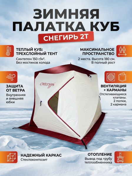 Зимняя палатка для рыбалки Снегирь 2Т - ОписаниеДвухместная зимняя палатка "Снегирь 2Т" станет вам отличным компаньоном на зимней рыбалке или во время активного отдыха на природе. Форма куба обеспечит дополнительным внутренним пространством, в отличии от моделей в форме купола. Два входа и размеры палатки позволяют с комфортом разместиться вдвоем. Две внутренние юбки, с системой крепления пола, предотвращают поддувание холодного воздуха.
