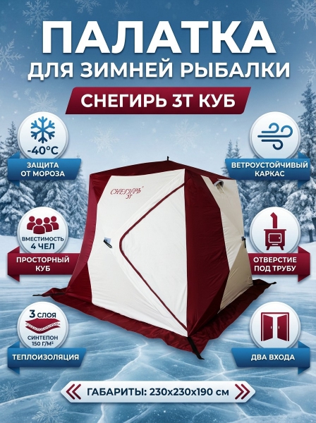 Несмотря на заявления производителей, что модель трехместная, комфортно будут себя чувствовать только двое. Потенциальное место для третьего человека займет печка, стол, личные вещи и рыбацкие снасти. Полога оснащены защитными юбками, которые препятствуют проникновению снега даже при сильном ветре. Их нельзя закрепить по краям палатки снаружи или изнутри, чтобы оставить вход открытым. Модель не комплектуется полом, поэтому его нужно приобретать отдельно. Зимняя палатка Снегирь 3Т выполнена в форме куба с шириной стенок 2300 мм и высотой по центру 1900 мм. Такая форма удобна в сборке и устойчива к порывам ветра.