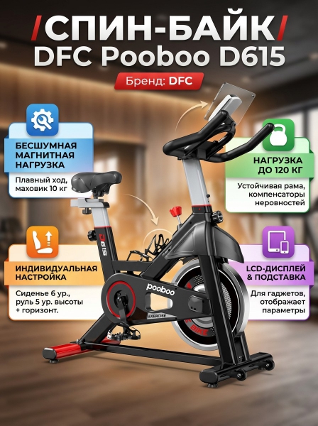 Спин-байк DFC Pooboo D615 - ОписаниеСомневаетесь? - Посмотрите рейтинг ТОП-10 по категории «Велотренажеры»Спин-байк Pooboo D615 чёрно-красного цвета — это современный тренажер кардио, который идеально подойдёт для регулярных домашних тренировок. Благодаря своей универсальности и расширенной системе настроек, он эффективно заменит занятия в фитнес-зале.
