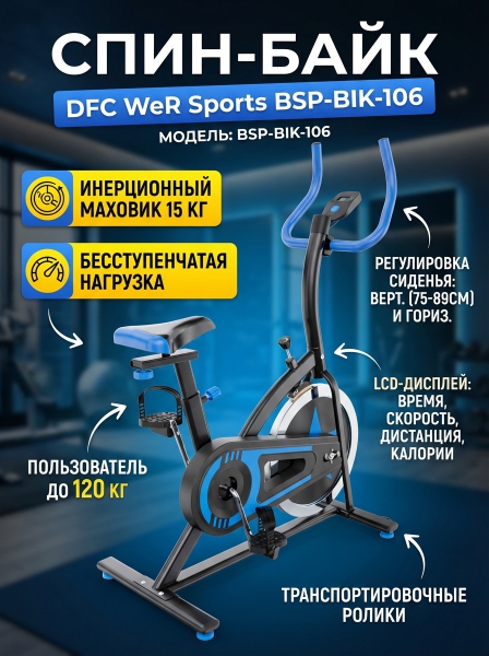 Велотренажер DFC DFC WeR Sports BSP-BIK-106 - ОписаниеСомневаетесь? - Посмотрите рейтинг ТОП-10 по категории «Велотренажеры»Спин-байк WeR Sports чёрно-синий цвета — это надежный и удобный велотренажёр для домашних тренировок. С его помощью вы сможете эффективно прорабатывать мышцы ног, улучшать выносливость, сжигать калории и поддерживать отличную физическую форму, не выходя из дома.