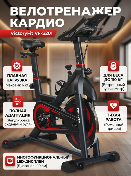 Спинбайк домашний VictoryFit VF-S201 - ОписаниеСомневаетесь? - Посмотрите рейтинг ТОП-10 по категории «Велотренажеры»Cпинбайк VictoryFit VF-S201 — тренажер является эффективным помощником при борьбе с лишним весом, а также способствующим укреплению кардиосистемы. Инерционная система нагрузки включает в себя маховик весом 6 кг, предусмотрено изменение уровней нагрузки за счет колодки, прижимающейся к маховику.