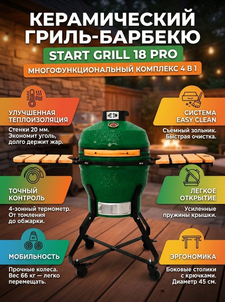 Керамический гриль-барбекю Start Grill 18 дюймов (зеленый) (45 см) - ДоставкаДоставка по Санкт-Петербургу: бесплатно, 2-3 дня Доставка по России: стоимость уточняйте у оператора. Керамический гриль-барбекю Start Grill 18 дюймов (зеленый) (45 см) - Отзывы0.0