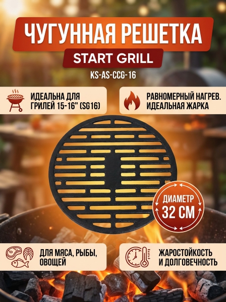 Чугунная решетка для гриля Start Grill KS-AS-CCG-16 - ОписаниеМногофункциональная и практичная решетка подходит для керамических грилей размером 15 или 16 дюймов. Данная решетка подходит для керамических грилей Start Grill SG16.