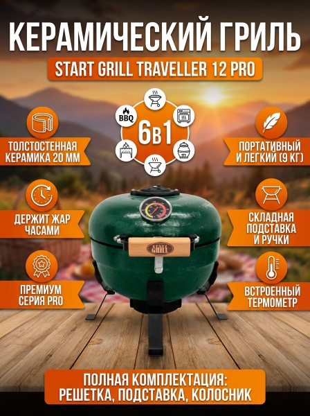 Портативный керамический гриль Start Grill TRAVELLER 12 дюймов (зеленый) (30,5 см) - ОписаниеДанная модель, не смотря на миниатюрность, относится к премиальной линейке PRO керамических грилей Start Grill. Грили PRO отличаются улучшенным составом керамической смеси, стильной цветовой гаммой, надежными пружинами крышки, а также оптимальной комплектацией.