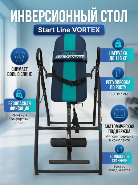 Инверсионный стол Start Line Vortex сине-бирюзовый с подушкой - БрендStart Line – это известный во всем мире производитель оборудования для здоровья и спорта, каждый экземпляр которого сопровождается гарантией качества.