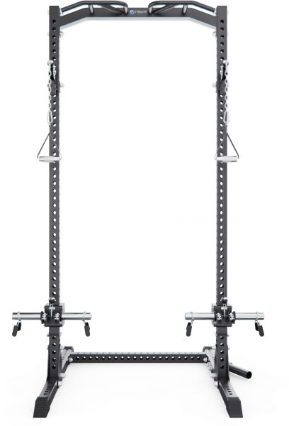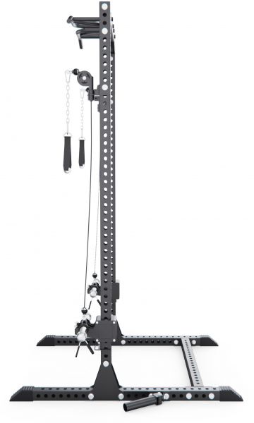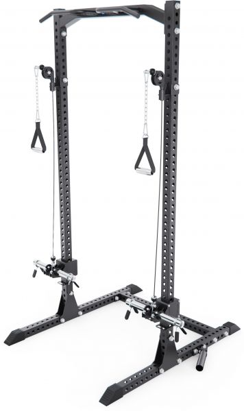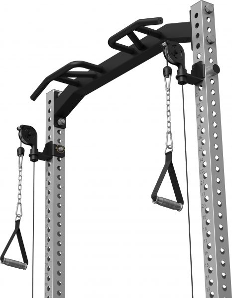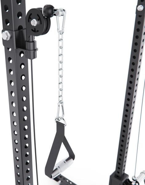 Встроенный кроссовер расширяет функциональность тренажера и позволяет прорабатывать все основные группы мышц. Кроме того, с одной стороны рамы предусмотрено специальное отверстие для установки грифа, которое позволяет использовать раму как Лэндмайн, выполняя жим и другие упражнения с естественной амплитудой движения.