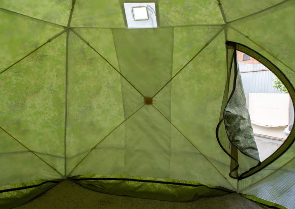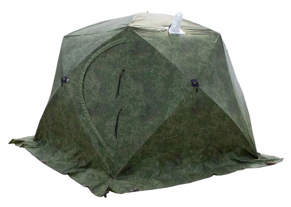 Конструкция имеет вывод под печную трубу, что дает дополнительные возможности для обогрева в холодное время года. Также есть москитная сетка, а значит, палатка подойдет и для летних походов.