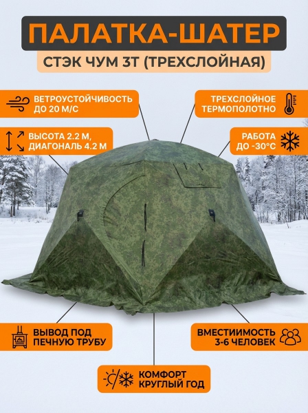 Палатка-шатер СТЭК ЧУМ 3Т (трехслойная) пиксель - ДоставкаДоставка по Санкт-Петербургу: бесплатно, 2-3 дня Доставка по России: стоимость уточняйте у оператора. Палатка-шатер СТЭК ЧУМ 3Т (трехслойная) пиксель - Отзывы0.0